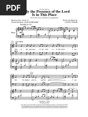 Key c chorus c em f dm surely the presence of the lord is in this place g7 c f i can feel his mighty power and its grace g7 c em i can hear the brush of angels wings f dm i see glory on each face g7 dm g7 c surely the presence of the lord is in this placeverse a c am f g in the midst of his children the lord said would be c am f g it doesnt take many it can be just two or three e am f c. About Press Copyright Contact us Creators Advertise Developers Terms Privacy Policy Safety How YouTube works Test new features Press Copyright Contact us Creators. Download Lanny Wolfe Surely The Presence Of The Lord Is In This Place sheet music notes and printable PDF score arranged for Piano Vocal Guitar Right-Hand Melody.